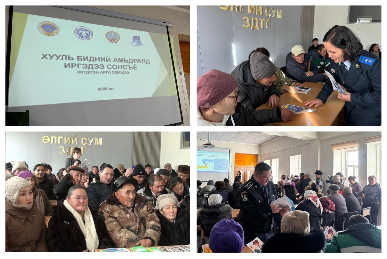 Баян-Өлгий аймгийн прокурорын газраас санаачлан тус аймгийн Цагдаагийн газар, Хүүхэд, гэр бүлийн хөгжил, хамгааллын газар, Өлгий сумын Засаг даргын Тамгын газартай хамтран “Хууль бидний амьдралд-Иргэдээ сонсъё” нэгдсэн арга хэмжээг зохион байгууллаа.